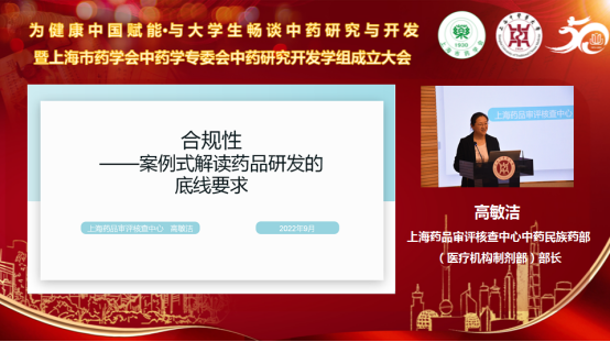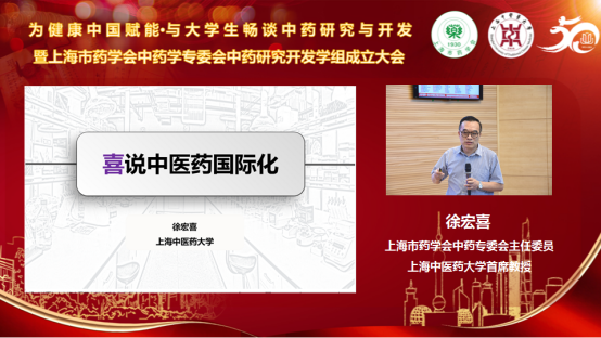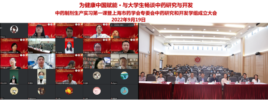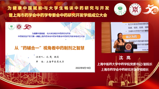 2022年9月19日,上海市药学会中药学专委会举办“为健康中国赋能·与大学生畅谈中药研究与开发暨上海市药学会专委会中药研究和开发学组成立大会”,以线上线下相结合的形式进行。上海市药学会秘书长刘丙龙,上海中医药大学副校长舒静,上海市药学会中药学专委会主任委员、首席教授徐宏喜出席会议,专委会及上海中医药大学中药学专业学生共计120余人参加会议。会议由上海市药学会中药学专委会中药研究和开发学组组长、上海中医药大学中药学院党委书记沈岚主持。