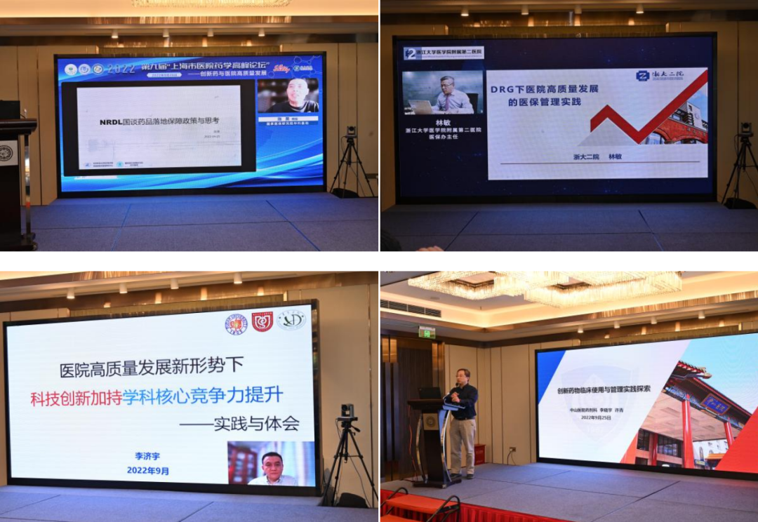 在学术报告环节,来自不同领域的4位专家进行了非常精彩的内容,其中来自国家医保研究院华科基地的陈昊教授围绕“NRDL国谈药品落地保障政策与思考”进行了分享,来自浙江大学医学院附属第二医院的林敏教授对“DRG下医院高质量发展的医保管理实践”的内容进行了深入浅出地讲解,而来自复旦大学附属华东医院的李济宇教授在着重从“高质量发展新形势下科技创新加持学科核心竞争力提升——实践与体会”角度进行全面交流,来自复旦大学附属中山医院药剂科许青教授受李晓宇教授委托则从“创新药物临床应用与管理实践探索”方面进行了声情并茂的授课。该环节分别由来自上海交通大学医学院附属仁济医院的林厚文教授、上海交通大学医学院附属瑞金医院的卞晓岚教授、同济大学附属同济医院的祝德秋教授以及上海交通大学附属第六人民医院南院的徐峰教授担任主持。