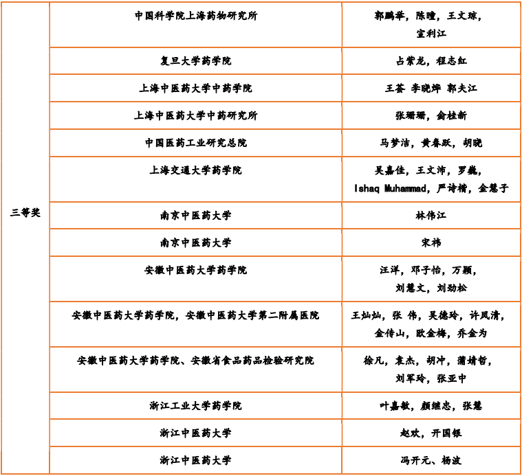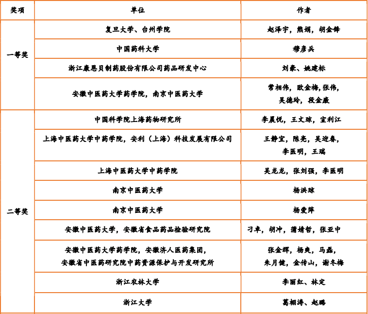 颁奖环节由中国科学院上海有机化学研究所的洪然教授、上海医药工业研究院的吴彤教授为获奖代表颁奖,并合影留念。附:获奖名单