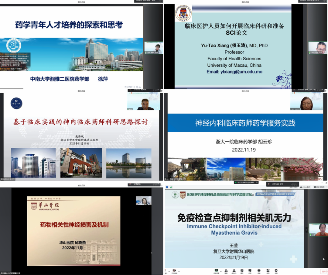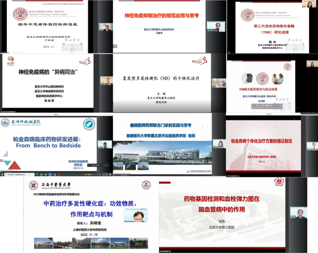 华山医院丁宏岩教授、程忻教授、全超教授、陈向军教授、马春来教授,上海中医药大学吴晓俊教授和北京大学第三医院刘芳教授分别从神经科医生、临床药师和基础研究角度讲述了脑血管病、多发性硬化诊断和治疗中的临床思维、基础研究和治疗药物的规范应用与思考。北京大学第三医院易湛苗教授和苏州科技城医院郭东凯主管药师介绍了帕金森的个体化治疗和临床药物研发进展。北京天坛医院杨莉教授、华山医院吴洵昳教授分别介绍了医师药师联合癫痫门诊和抗癫痫药物的前沿进展。