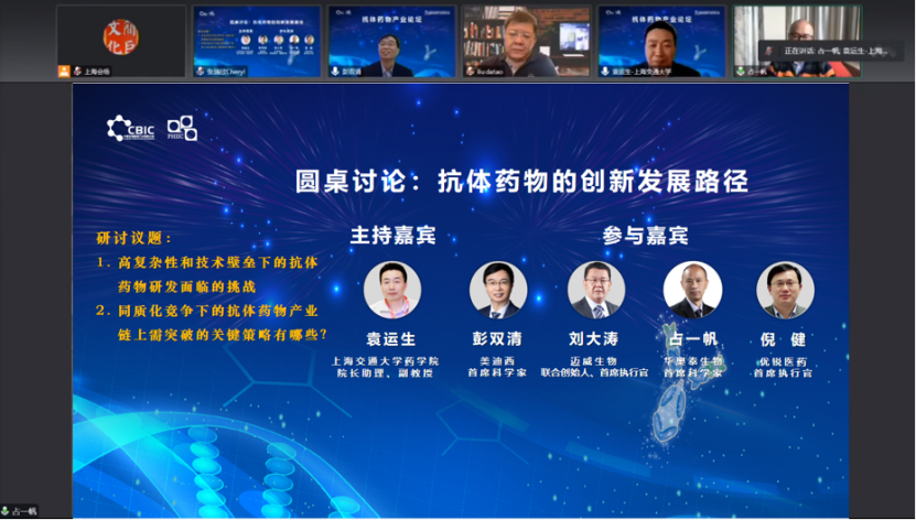 同时在圆桌讨论阶段,上海美迪西生物医药股份有限公司首席科学家彭双清博士、上海迈威生物科技股份有限公司首席执行官刘大涛博士、占一帆博士和倪健博士就目前国内抗体药物研发的瓶颈和同质化难题分享了各自专业的见解,上海市药学会生化与生物技术药物专委会袁运生副教授担任圆桌讨论主持嘉宾。
