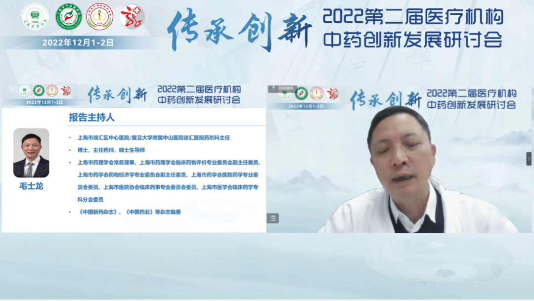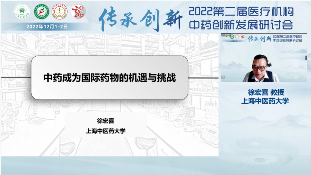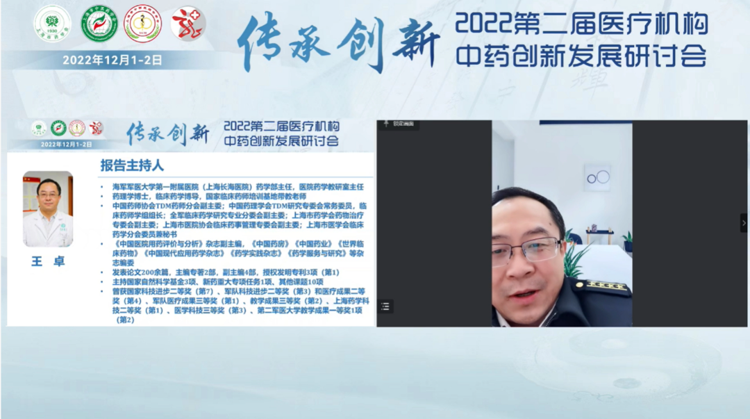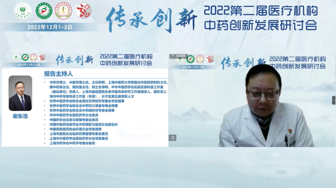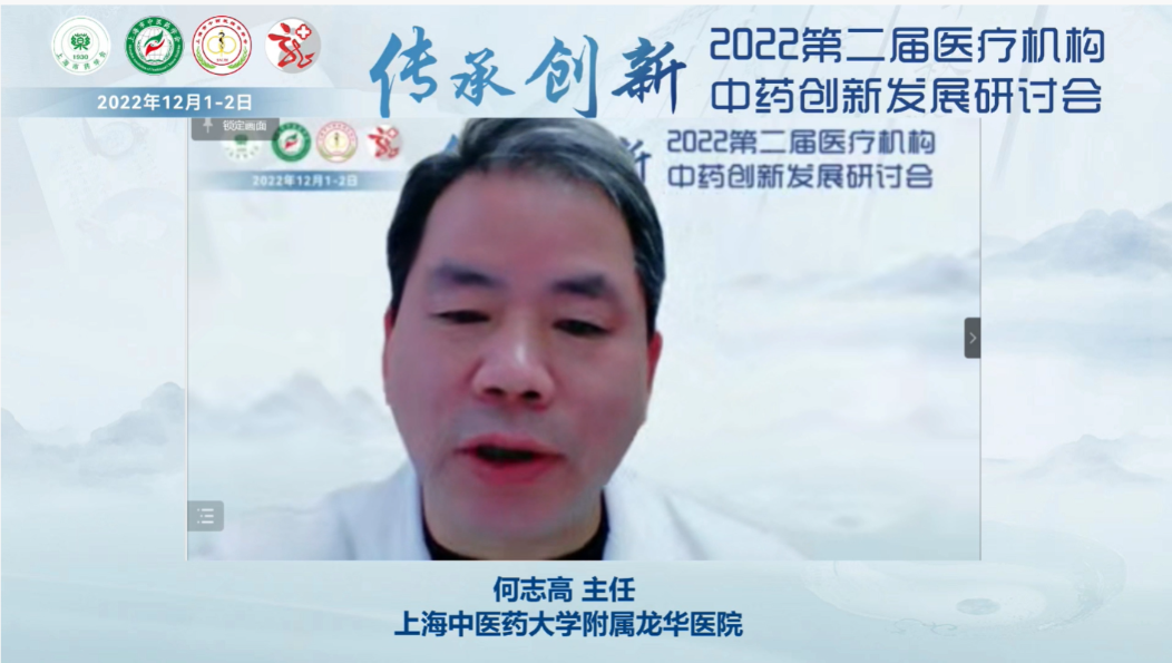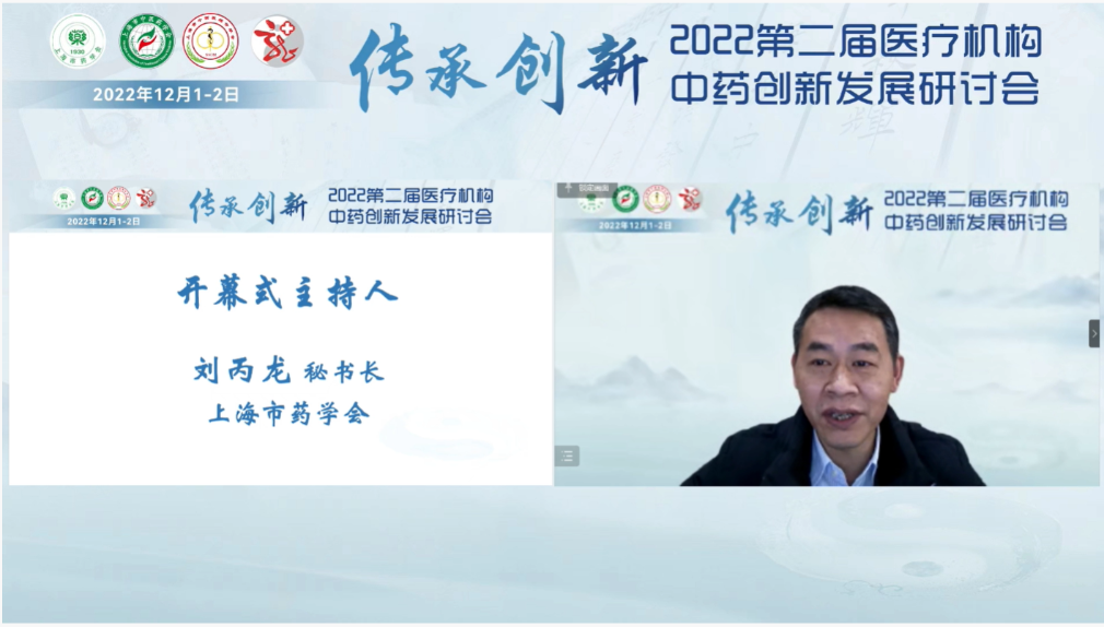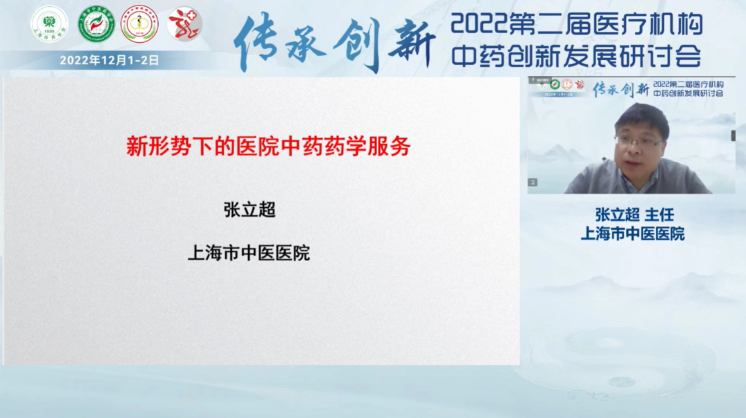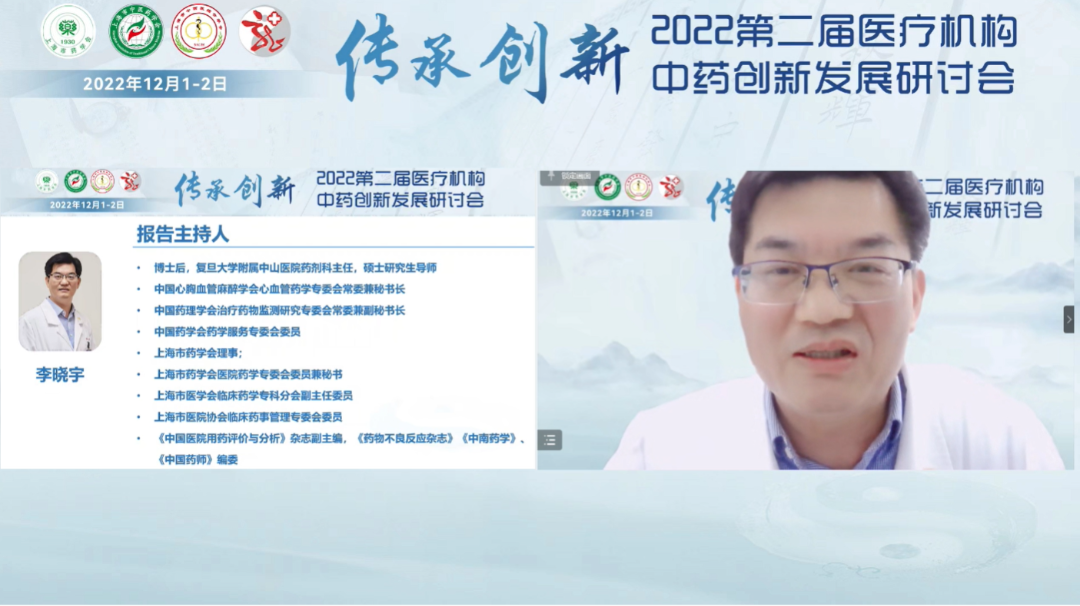 12月1-2日,2022第二届医疗机构中药创新发展研讨会于线上顺利举办。本次研讨会由上海市药学会、上海市中医药学会、上海市中西医结合学会联合主办,上海中医药大学附属龙华医院承办,上海中医药大学徐宏喜教授、上海中医药大学附属龙华医院何志高主任担任大会主席。上海市卫生健康委员会副主任、上海市中医药管理局副局长胡鸿毅教授,上海市药学会理事长陈红专教授、上海中医药大学附属龙华医院陈跃来院长、上海市药学会吕迁洲监事长、刘丙龙秘书长,海军军医大学第二附属医院陈万生教授、国家药典委员会业务管理处宋宗华副处长、上海市食品药品检验研究院季申教授、上海中医药大学附属曙光医院刘力主任、上海中医药大学附属岳阳中西医结合医院黄瑾主任等领导、嘉宾参加了开幕式,两天超过2100人次观看了会议直播。