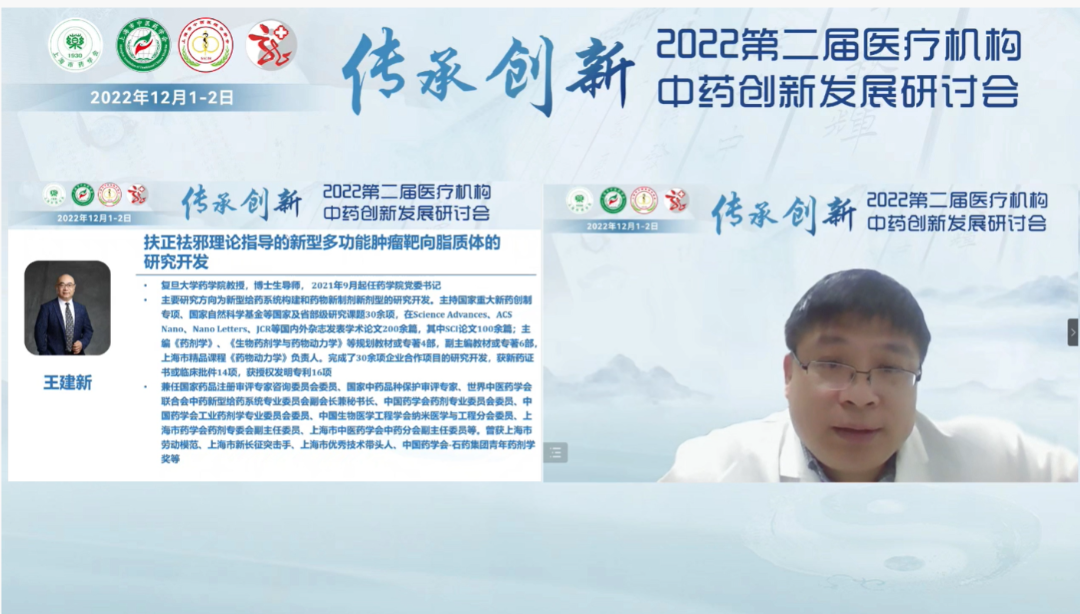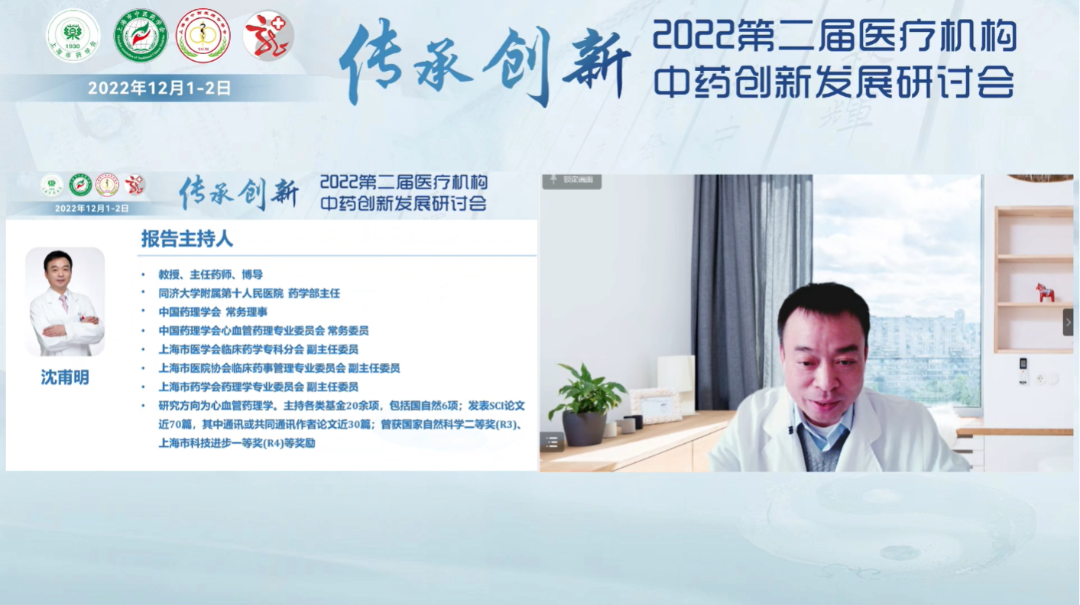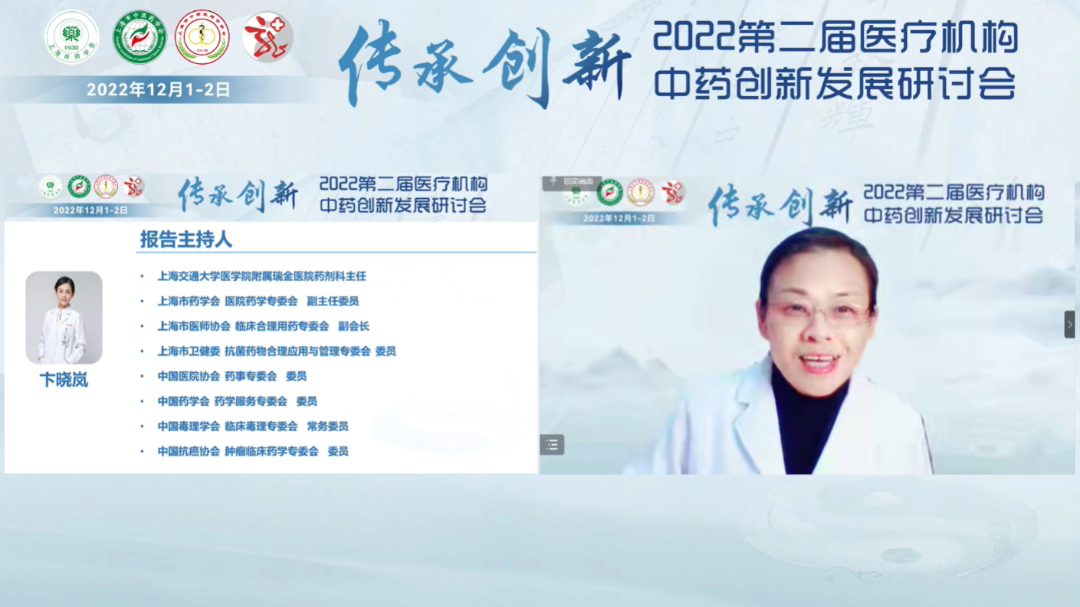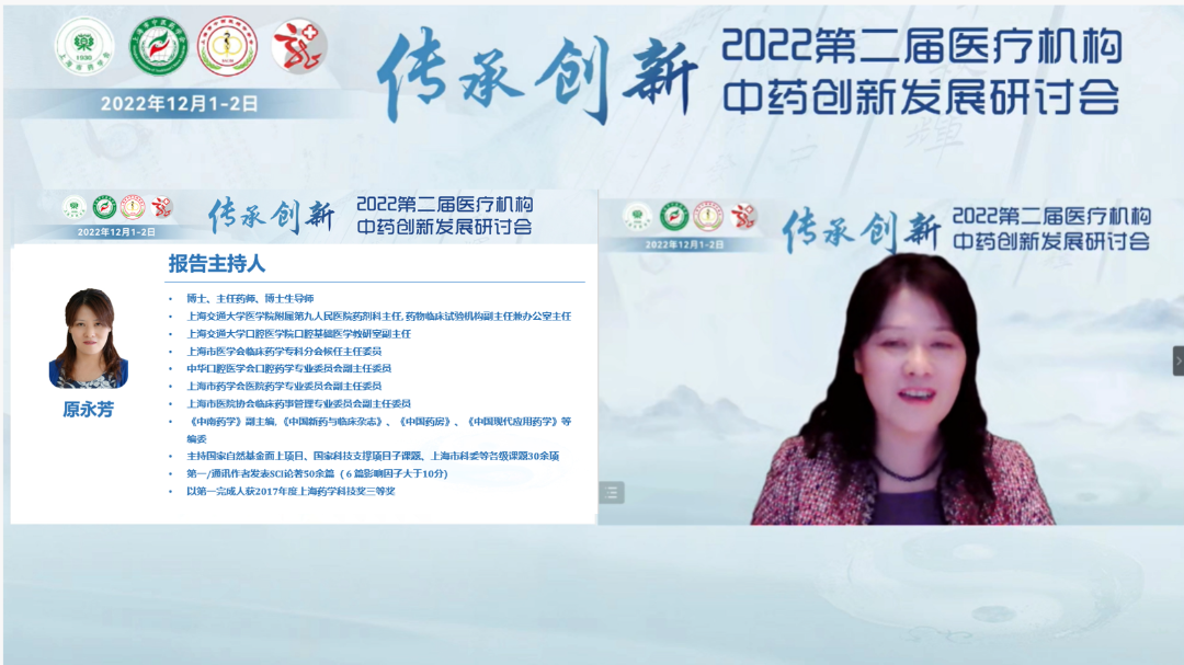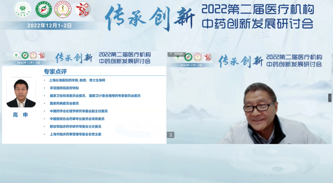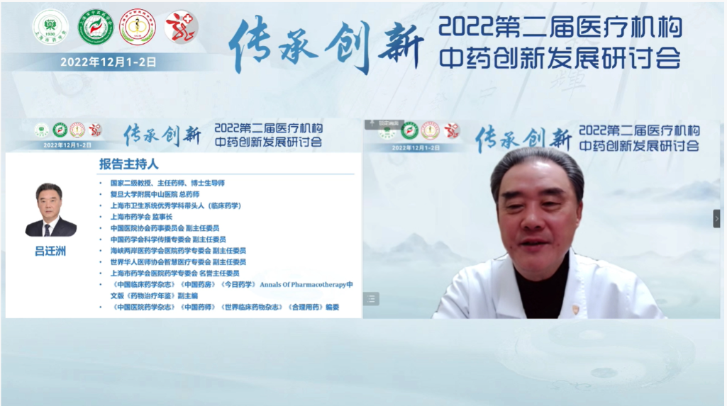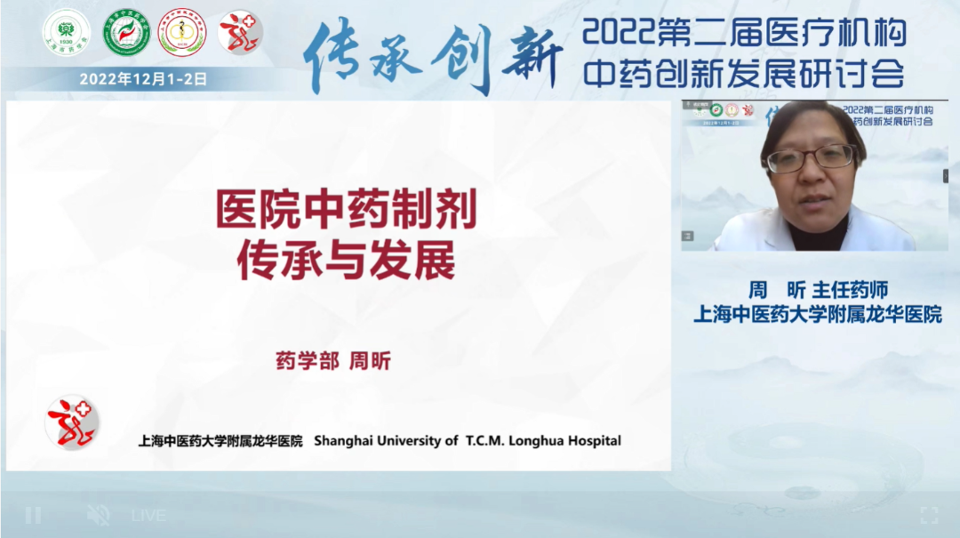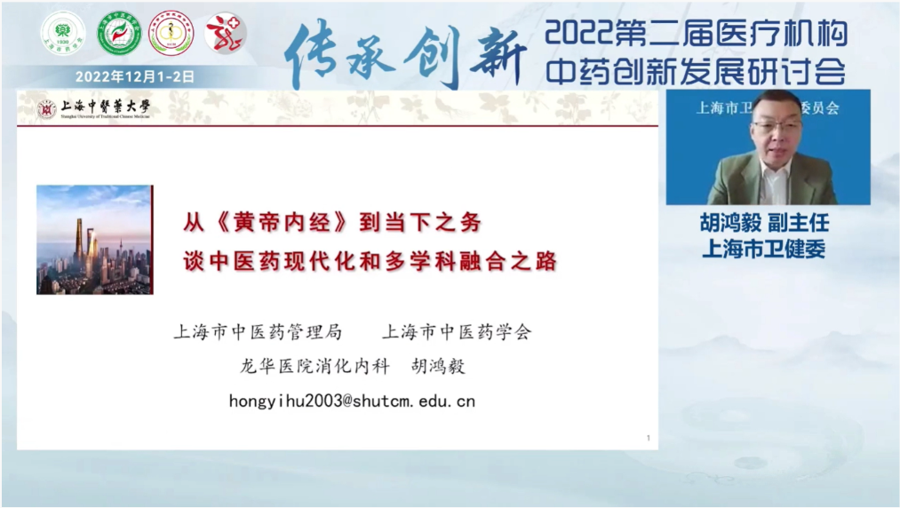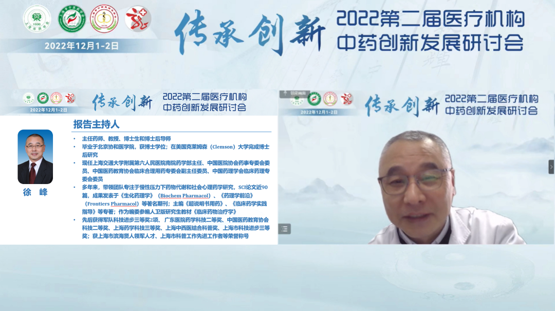 12月1-2日,2022第二届医疗机构中药创新发展研讨会于线上顺利举办。本次研讨会由上海市药学会、上海市中医药学会、上海市中西医结合学会联合主办,上海中医药大学附属龙华医院承办,上海中医药大学徐宏喜教授、上海中医药大学附属龙华医院何志高主任担任大会主席。上海市卫生健康委员会副主任、上海市中医药管理局副局长胡鸿毅教授,上海市药学会理事长陈红专教授、上海中医药大学附属龙华医院陈跃来院长、上海市药学会吕迁洲监事长、刘丙龙秘书长,海军军医大学第二附属医院陈万生教授、国家药典委员会业务管理处宋宗华副处长、上海市食品药品检验研究院季申教授、上海中医药大学附属曙光医院刘力主任、上海中医药大学附属岳阳中西医结合医院黄瑾主任等领导、嘉宾参加了开幕式,两天超过2100人次观看了会议直播。