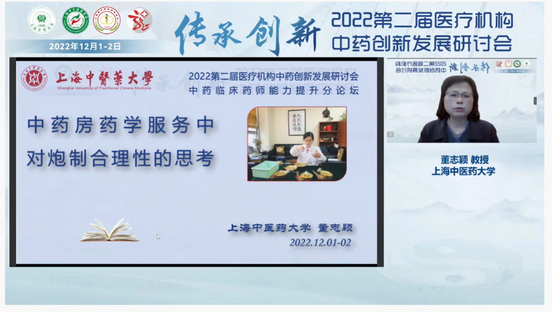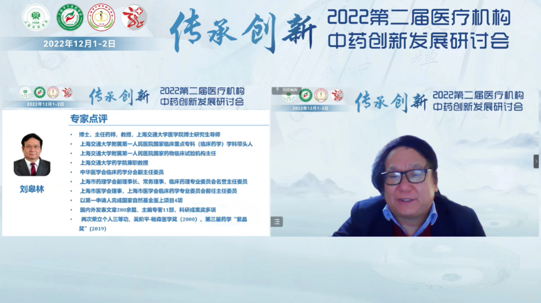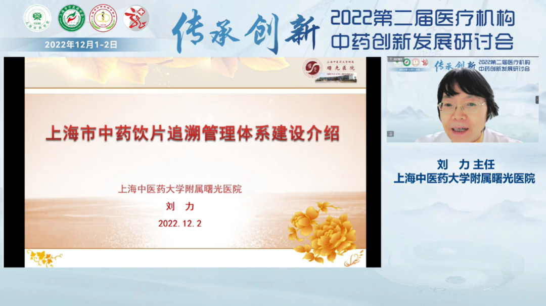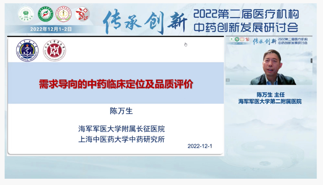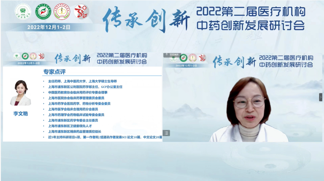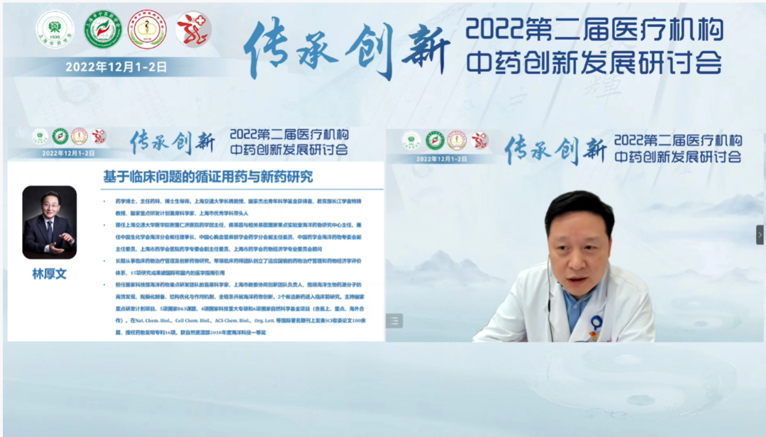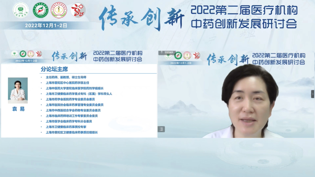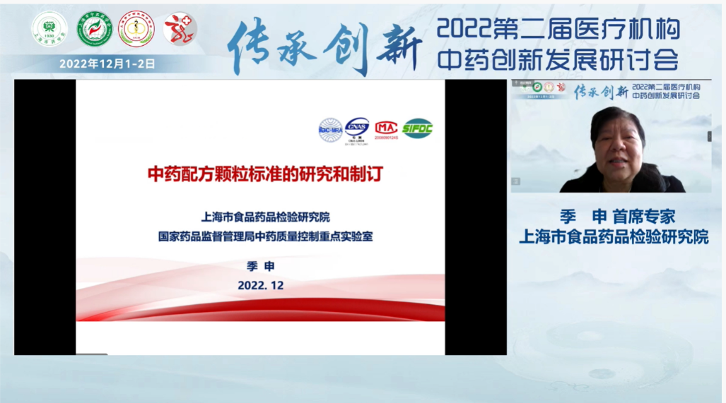 12月1-2日,2022第二届医疗机构中药创新发展研讨会于线上顺利举办。本次研讨会由上海市药学会、上海市中医药学会、上海市中西医结合学会联合主办,上海中医药大学附属龙华医院承办,上海中医药大学徐宏喜教授、上海中医药大学附属龙华医院何志高主任担任大会主席。上海市卫生健康委员会副主任、上海市中医药管理局副局长胡鸿毅教授,上海市药学会理事长陈红专教授、上海中医药大学附属龙华医院陈跃来院长、上海市药学会吕迁洲监事长、刘丙龙秘书长,海军军医大学第二附属医院陈万生教授、国家药典委员会业务管理处宋宗华副处长、上海市食品药品检验研究院季申教授、上海中医药大学附属曙光医院刘力主任、上海中医药大学附属岳阳中西医结合医院黄瑾主任等领导、嘉宾参加了开幕式,两天超过2100人次观看了会议直播。