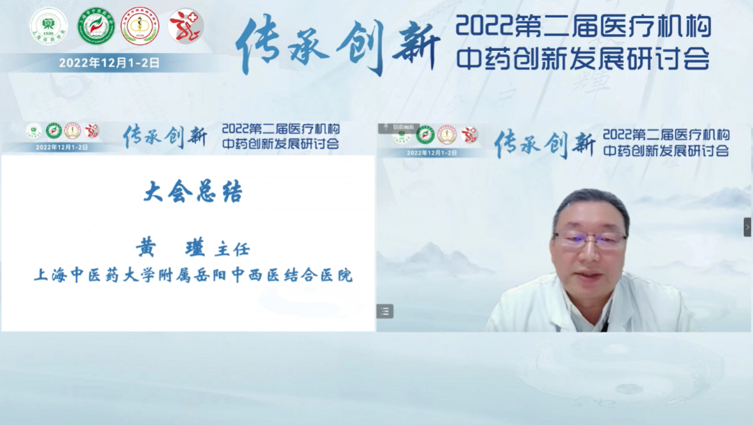 上海中医药大学附属光华医院谢东浩主任、上海市第六人民医院南院徐峰主任、上海市东方医院马雅斌主任、复旦大学附属中山医院李晓宇主任、上海长海医院王卓主任、徐汇区中心医院毛士龙主任担任主持人,上海市第一人民医院刘皋林教授、上海长海医院高申教授、浦东新区公利医院李文艳主任对各位药师开展的药学监护工作给予了专业的指导和精准的点评。最后,黄瑾主任进行大会总结,表示本次分享会起到很好的交流促进作用,各位专家对本次会议给予了鼎力支持和悉心指导,各位药师对案例精心准备和展示。中药临床药师的进步离不开专家前辈们的提携和帮助,在此一并表示感谢。2022第二届医疗机构中药创新发展研讨会至此落下帷幕,期待明年相见!