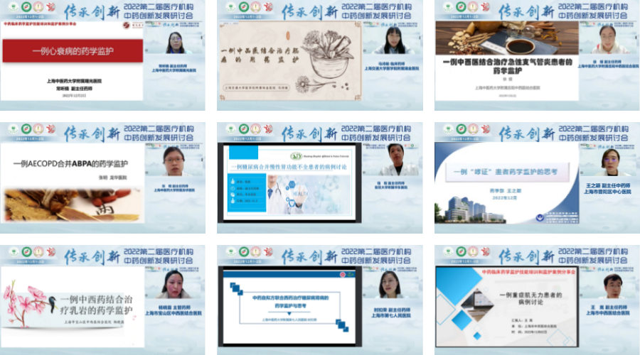 12月2日下午案例分享会由黄瑾主任担任会议主席,邀请了上海中医药大学附属曙光医院常昕楠副主任药师、上海交通大学医学院附属瑞金医院马诗瑜药师、上海中医药大学附属岳阳中西医结合医院徐熠副主任药师、上海中医药大学附属龙华医院张明副主任药师、华东医院钱程副主任药师、普陀区中心医院王之颖副主任中药师、宝山区中西医结合医院杨晓露主管中药师、上海市第七人民医院时扣荣副主任、上海市中西医结合医院王嵩副主任药师,基于自身的工作经验围绕心衰病、中西医结合治疗肠癌、中西医结合治疗急性支气管炎、AECOPD合并ABPA、糖尿病合并慢性肾功能不全、“哮证”、中西药结合治疗乳岩、中药自拟方联合西药治疗糖尿病肾病、重症肌无力等方面,带来了各具特色的临床药学监护案例分享。