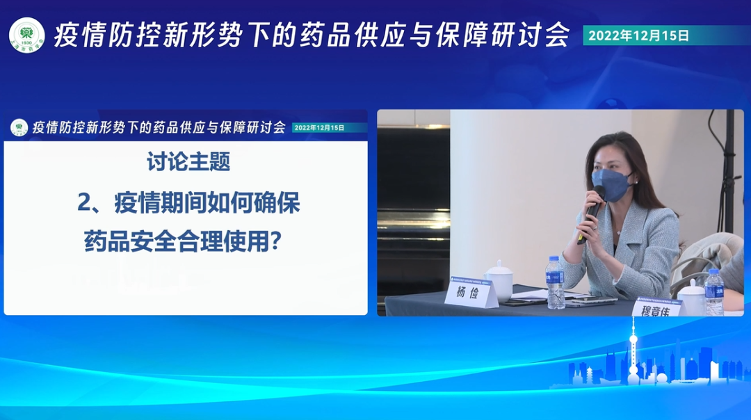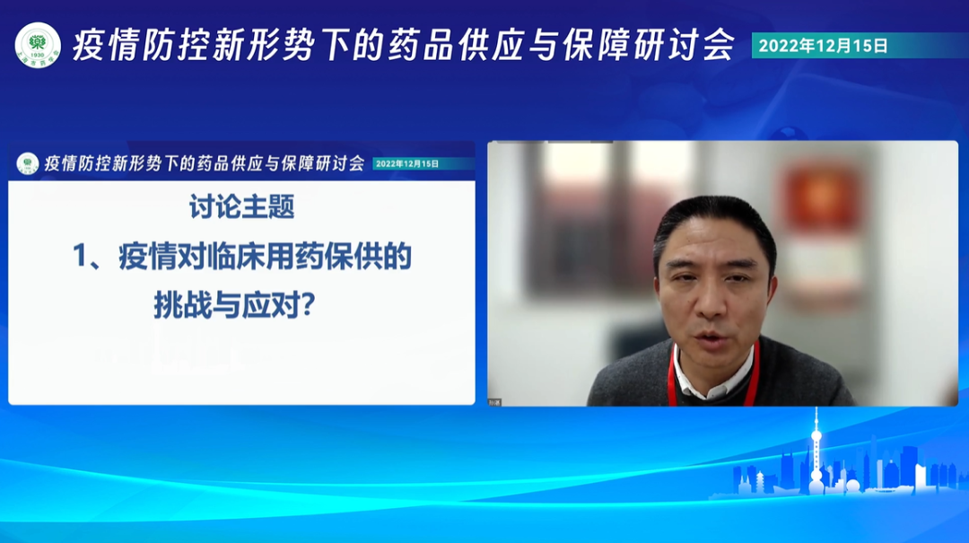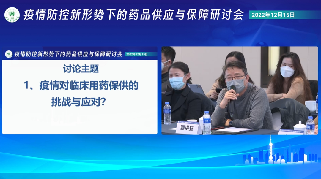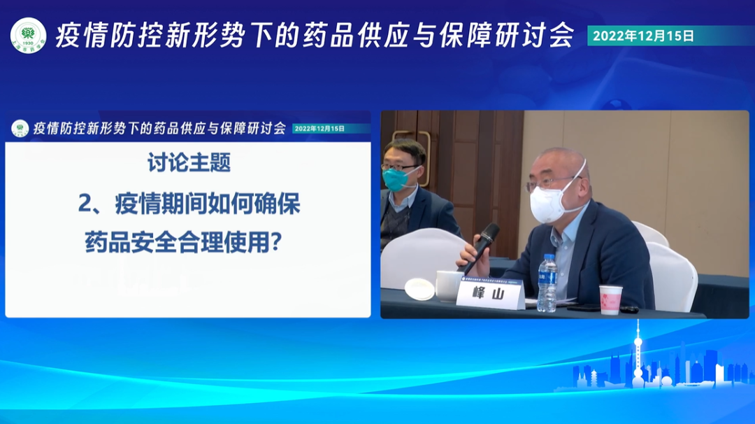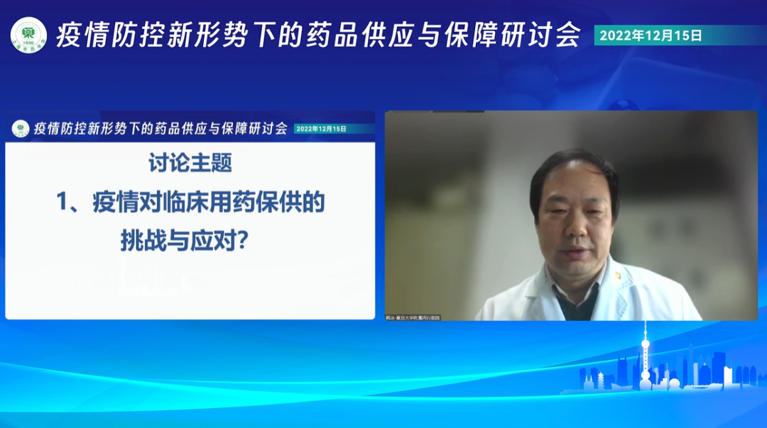 讨论环节邀请了来自监管部门、医疗机构、药品生产企业、药品流通企业、医药院所等单位的专家和代表,围绕“疫情对临床用药保供的挑战与应对、疫情期间如何确保药品安全合理使用”等主题开展交流研讨。上海市药监局药品监管处四级调研员朱晨茵、上海老年医学中心执行院长孙湛、闵行区中心医院药剂科韩冰主任、浦东新区公利医院药剂科李文艳主任、徐汇区凌云街道社区卫生服务中心顾洪安主任、海军军医大学军队药材保障中心舒丽芯主任、龙华医院药剂科何志高主任、辉瑞制药地方市场准入负责人杨俭、凯宝药业董事长穆竟伟、华润医药(上海)总经理峰山先后从不同的角度表达了鲜明、务实的观点,为新形势下药品的供应保障工作建言献策、贡献智慧。
