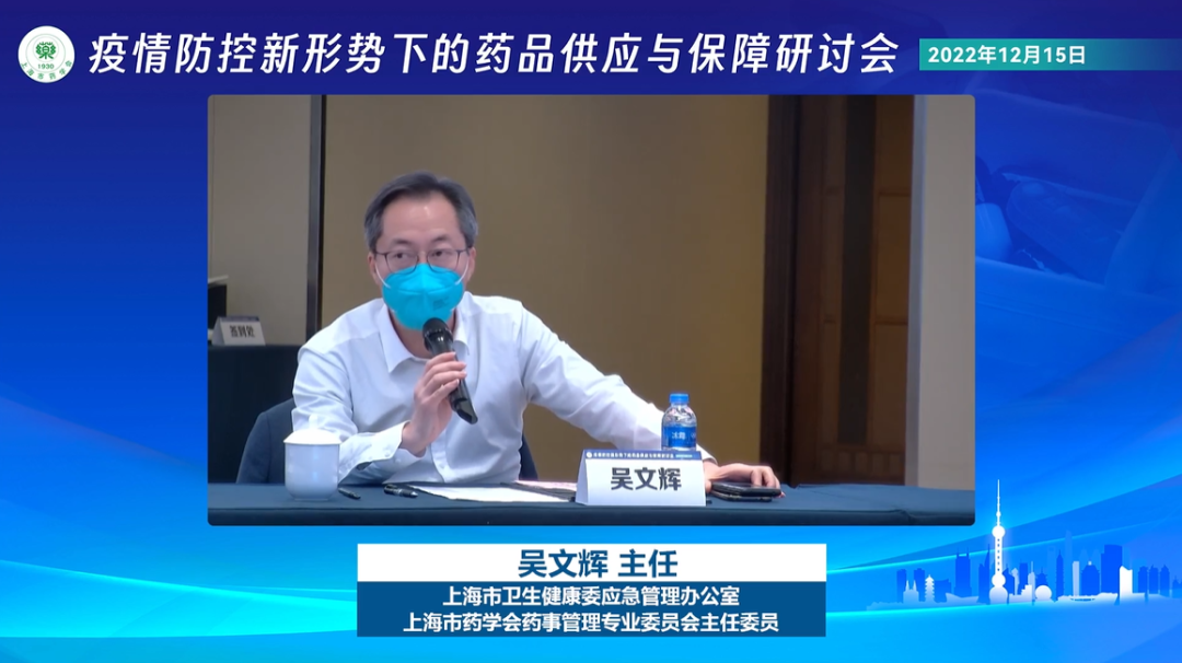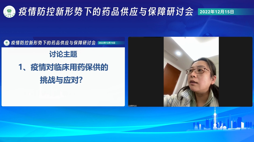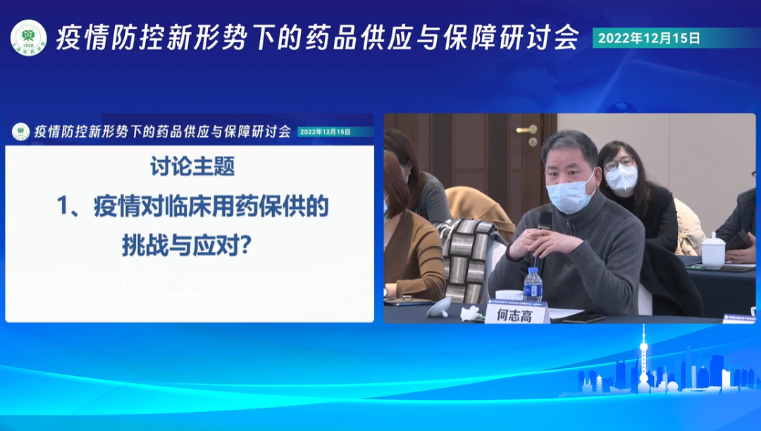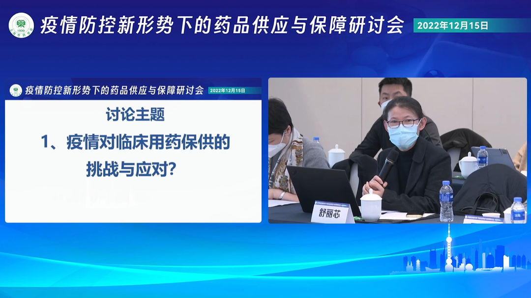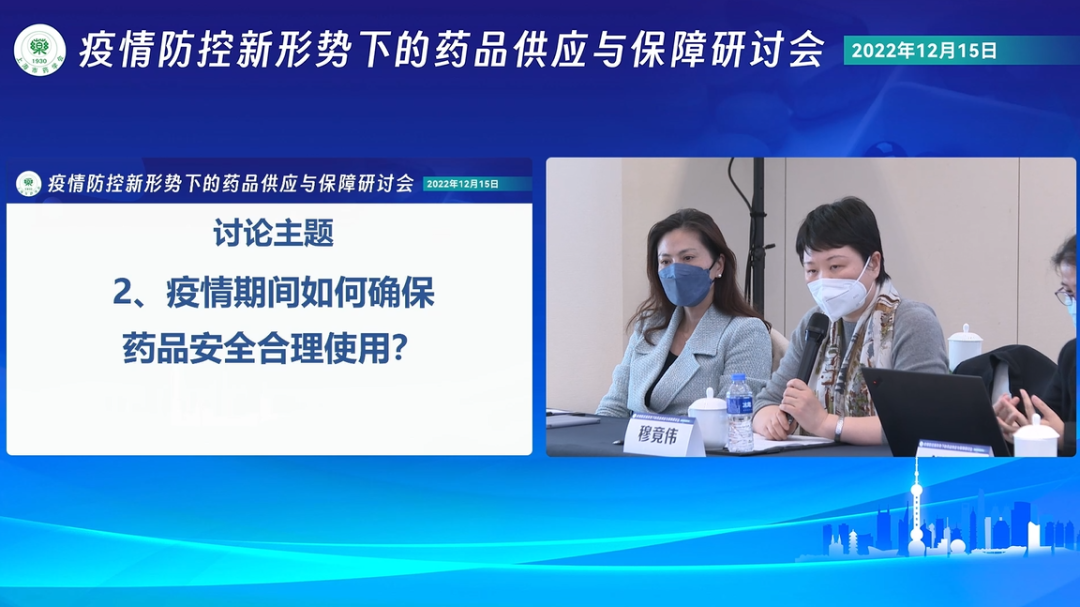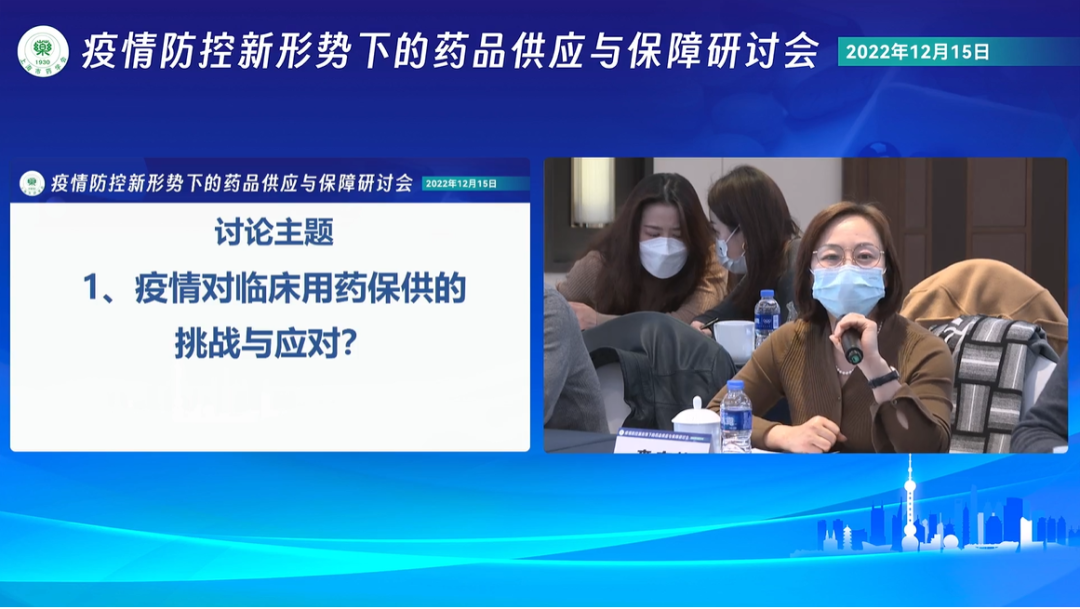 讨论环节邀请了来自监管部门、医疗机构、药品生产企业、药品流通企业、医药院所等单位的专家和代表,围绕“疫情对临床用药保供的挑战与应对、疫情期间如何确保药品安全合理使用”等主题开展交流研讨。上海市药监局药品监管处四级调研员朱晨茵、上海老年医学中心执行院长孙湛、闵行区中心医院药剂科韩冰主任、浦东新区公利医院药剂科李文艳主任、徐汇区凌云街道社区卫生服务中心顾洪安主任、海军军医大学军队药材保障中心舒丽芯主任、龙华医院药剂科何志高主任、辉瑞制药地方市场准入负责人杨俭、凯宝药业董事长穆竟伟、华润医药(上海)总经理峰山先后从不同的角度表达了鲜明、务实的观点,为新形势下药品的供应保障工作建言献策、贡献智慧。