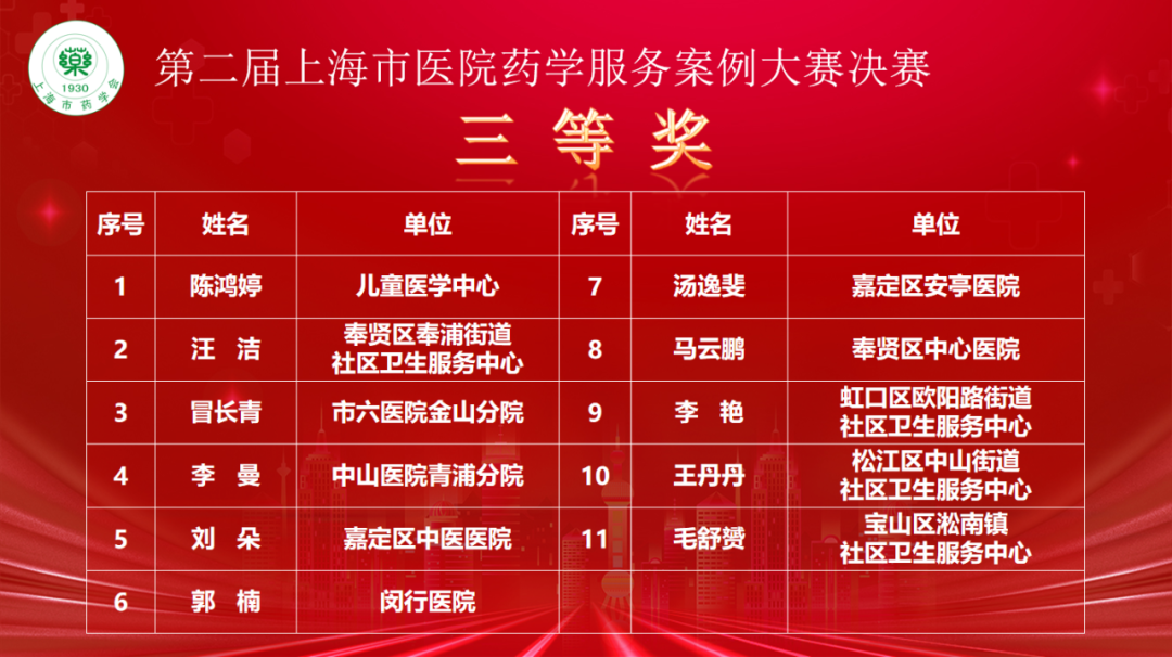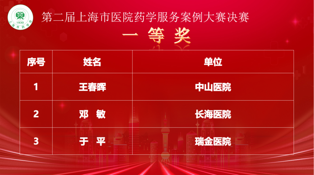 最后,在陈万生主任的主持下进行颁奖仪式,在紧张的氛围中陈万生主任宣读获奖名单,并由各参会领导和专家为此次大赛获奖着进行颁奖。在本届大赛中共决胜出一等奖3名、二等奖6名、三等奖11名和优胜奖26名。每位获奖选手都是在众多参赛者中脱颖而出的佼佼者,其中获得一等奖的3名选手将代表上海地区参加由中国药学会主办的“论剑-全国药学服务经典案例评选”,以展示上海地区药学服务的精湛水平,为全国药学服务领域的发展贡献力量。