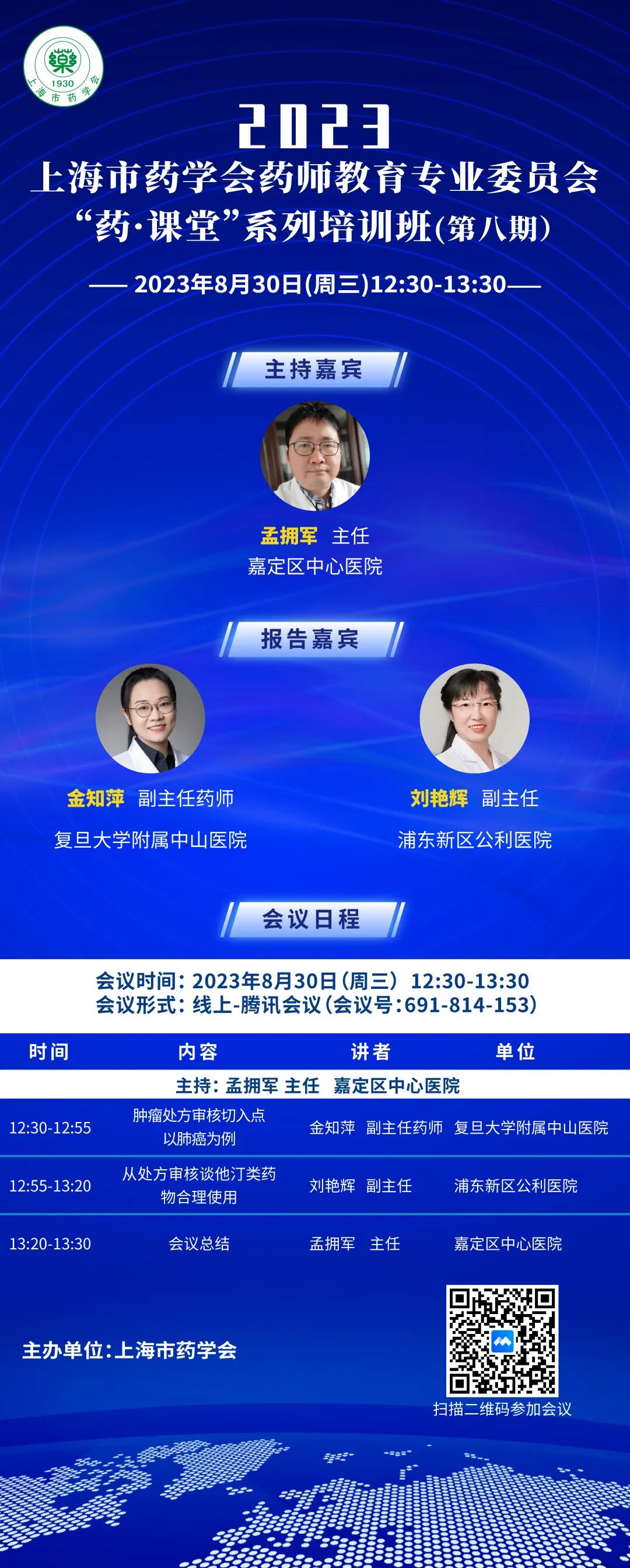 为提高医疗机构药师临床合理用药水平,充分发挥药师在合理用药、医疗质量管理和服务管理中的作用与价值,保障患者用药安全,上海市药学会计划举办“2023上海市药学会药师教育专业委员会“药·课堂”系列培训班”。