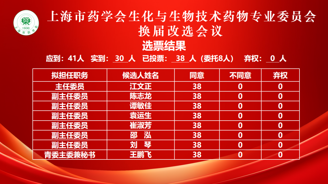 到场的委员候选人一一进行自我介绍,举手表决新一届专委会组成,经委员无记名等额投票、上海市药学会办公室工作人员当场计票,江文正当选为上海市药学会第十届生化与生物技术药物专委会主任委员,陈志龙、谭敏佳、袁运生、崔淑芳、 邵泓、刘琴当选副主任委员,王鹏飞当选秘书兼青年委员会主委。同时,郭葆玉、邱蔚然、潘卫将作为专委会的顾问, 陈钢作为专委会的荣誉委员,继续支持学会的工作。