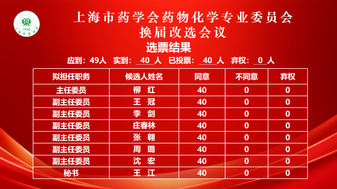 随后按照公平、公正、公开的原则和流程,经委员无记名等额投票、上海市药学会办公室工作人员当场计票,柳红当选为上海市药学会第十届药物化学专委会主任委员,王冠、李剑、庄春林、张翱、周璐、沈宏当选副主任委员,王江当选秘书。同时,陈芬儿院士作为专委会的名誉主任委员,继续支持学会的工作。此次选举充分展示了上海市药物化学领域人才辈出、昂扬向上的发展态势。
