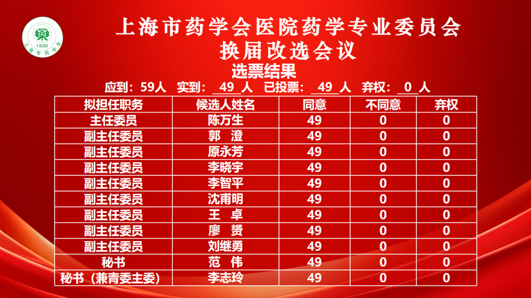 在上海市药学会第十三届医院药学专委会成立的基础上,经委员无记名等额投票、上海市药学会办公室工作人员当场计票,陈万生当选为上海市药学会第十三届医院药学专委会主任委员,郭澄、原永芳、李晓宇、李智平、沈甫明、王卓、廖赟、刘继勇当选为副主任委员,李志玲当选为秘书兼青委主委,范伟当选为秘书。