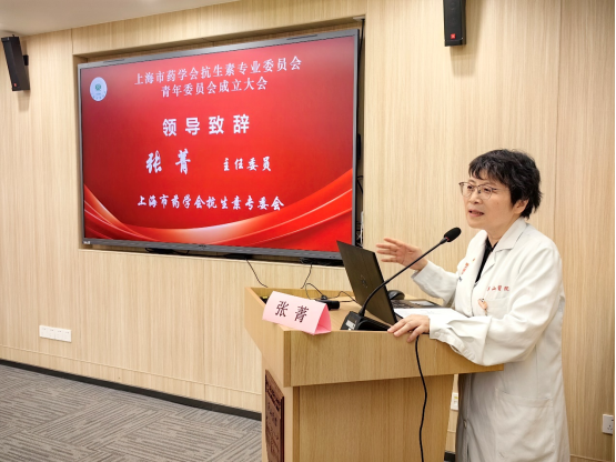 会议上半场为上海市药学会抗生素专业委员会青年委员会成立大会。首先由上海市药学会抗生素专委会主任委员张菁致辞,她表示,她上任后的重要工作之一便是推动青年委员会的成立,希望为青年学者提供一个学术交流、科研合作和职业发展的重要平台。通过介绍抗生素专委会的历史,老一辈专家戴自英教授、汪复教授、陈代杰教授等在抗生素事业上的热爱和贡献,激励青年委员利用好平台,在抗生素领域多发出青年人的声音。她强调首届青年委员会的组建来自药品研发和临床应用各个环节的专业人士,包括药企的科研人员、医生、药师和检验技师,通过跨学科合作,共同助力创新抗菌药物的研发和应用。张菁主任委员对青年委员会的未来发展寄予厚望,祝愿青委会越办越好。