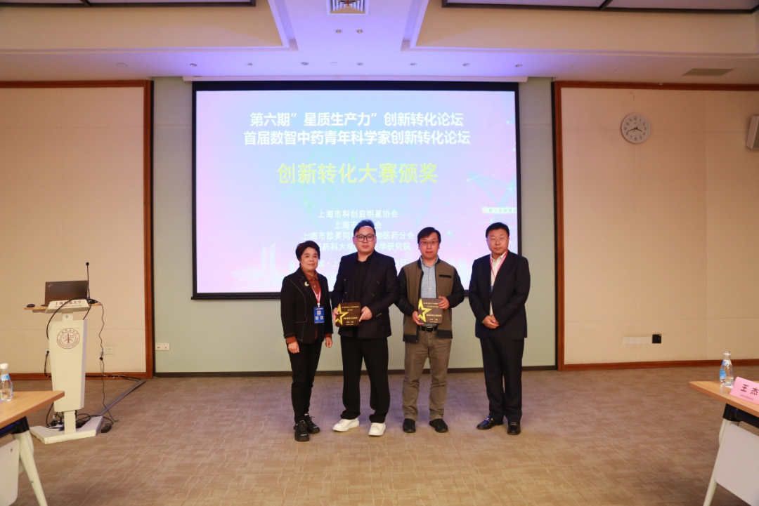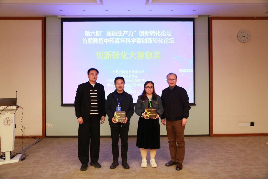 在前五期“星质生产力”创新转化论坛顺利举办的基础上,本次转化论坛聚焦“数智中药”,吸引了来自上海交通大学、上海科技大学、华东师范大学、中科院上海药物研究所、中国医学科学院药物研究所、中国药科大学、上海生物技术研究院、上海中医药大学、云南中医药大学、上海医药集团、昊海生物科技、上海江瀚健康科技、上海科技大学、基汇资本、耀云资本、恒旭资本、捷客咨询等科研院校、医药企业、社团协会、投融资机构的30余位领导与专家代表积极参与。前期经过层层筛选和辅导,最终遴选出“数智岐黄”、“DNA编码天然产物库”、“中药复方软坚清脉颗粒”、“药用植物现代技术开发平台”等4个聚焦“数智中药”,成熟度高,转化前景好的项目参加了本次路演。路演项目均荣获第六届“星质生产力” 创新转化大赛金奖!